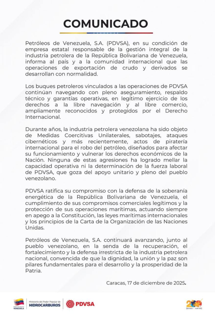 A través de un comunicado compartido en redes sociales, la estatal venezolana afirmó que «los buques petroleros vinculados a las operaciones de Pdvsa continúan navegando con pleno aseguramiento, respaldo técnico y garantías operativas», en legítimo ejercicio de los derechos a la libre navegación y al libre comercio, reconocidos y protegidos por el Derecho Internacional.